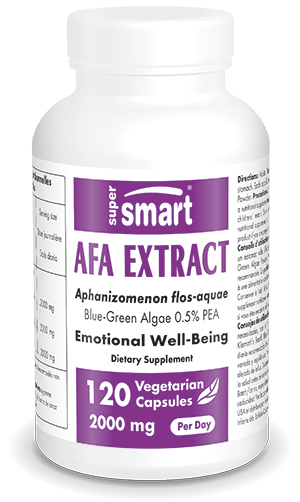 AFA Extract est un complément alimentaire d’AFA (Aphanizomenon flos-aquae), une super algue bleue de composition nutritionnelle exceptionnelle : les huit acides aminés essentiels, de nombreuses vitamines (dont la vitamine K et la vitamine B12), plus de 130 minéraux et éléments-traces… Il a fait l’objet d’une étude pilote très encourageante menée à la clinique IFM de Falun en Suède (1), qui a mis en évidence son principal bienfait : contribuer à améliorer l’humeur.