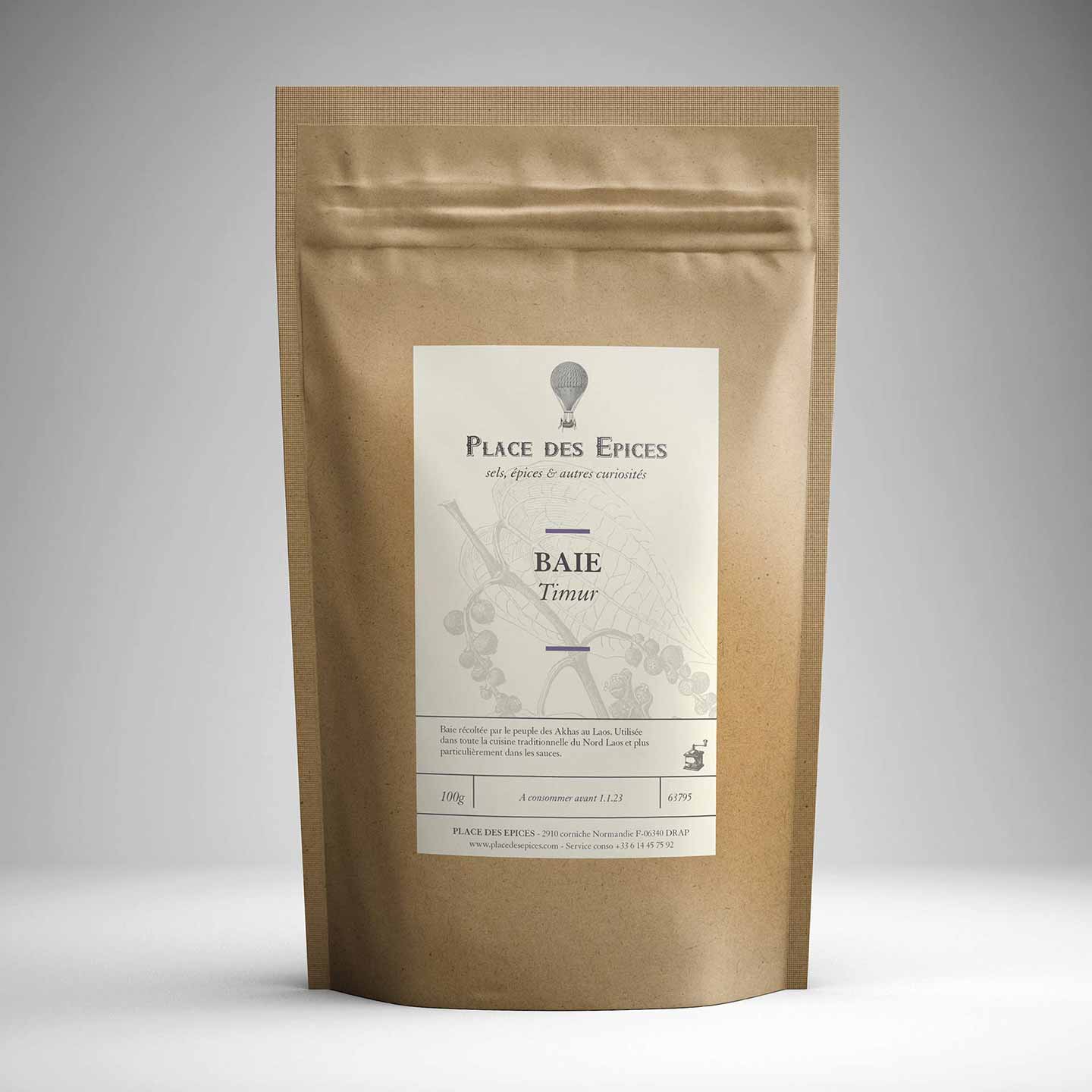 Appelé aussi baie de Timut ou poivre pamplemousse, le poivre de Timur est une petite baie brune provenant du Népal, où elle pousse à l’état sauvage sur les contreforts de l’Himalaya. Il s’agit d’un faux poivre, comme le poivre de Sichuan ou la baie des Bataks, car il ne provient pas du Piper nigrum (le poivrier traditionnel) mais d’un arbuste de la famille des Zanthoxylum.