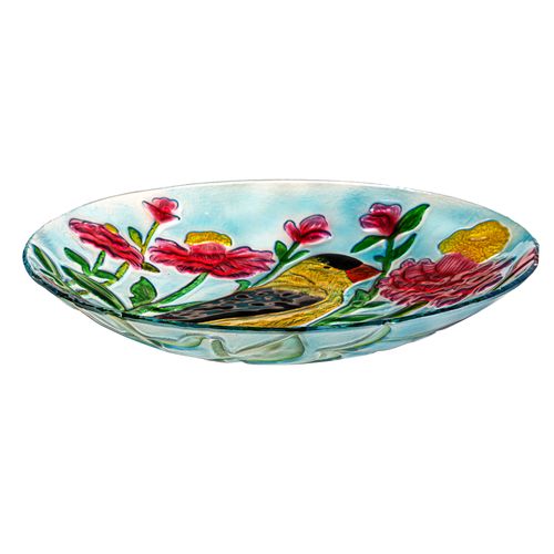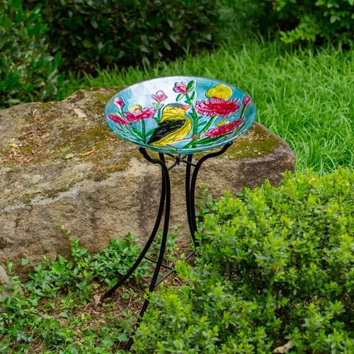 Bain d’oiseaux en verre de 18″ avec oiseau chardonneret.