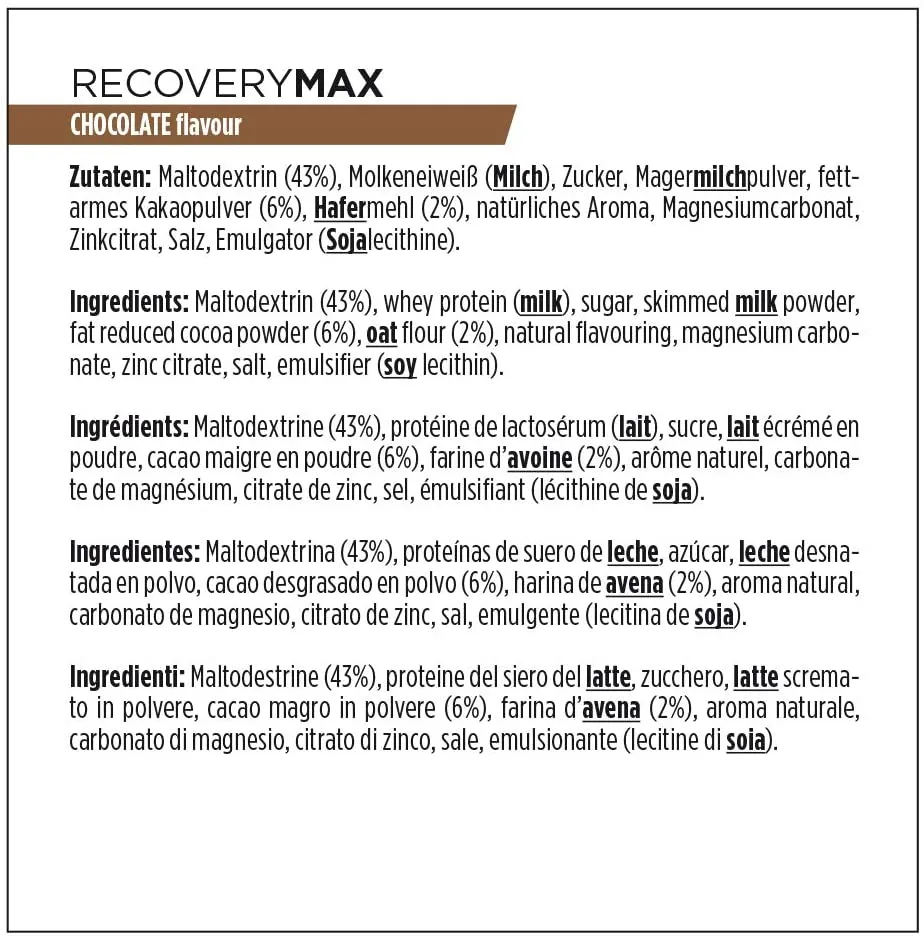 - Glucides hautement concentrés (tels que maltodextrine de maïs) et flocons d’avoine de haute qualité