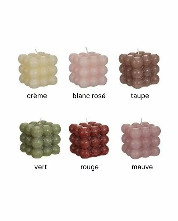 Disponible dans notre gamme en blanc cassé, taupe, vert raisin, marron, rouge et rose, notre bougie cube Bubble peut s’adapter à toutes les pièces et à tous les styles de décoration. Si vous cherchez une jolie bougie sans parfum pour votre chambre pour un moment cocooning ou un moment cosy dans votre salon, notre bougie cube en forme de bulles est un choix de qualité pour la décoration de la maison.