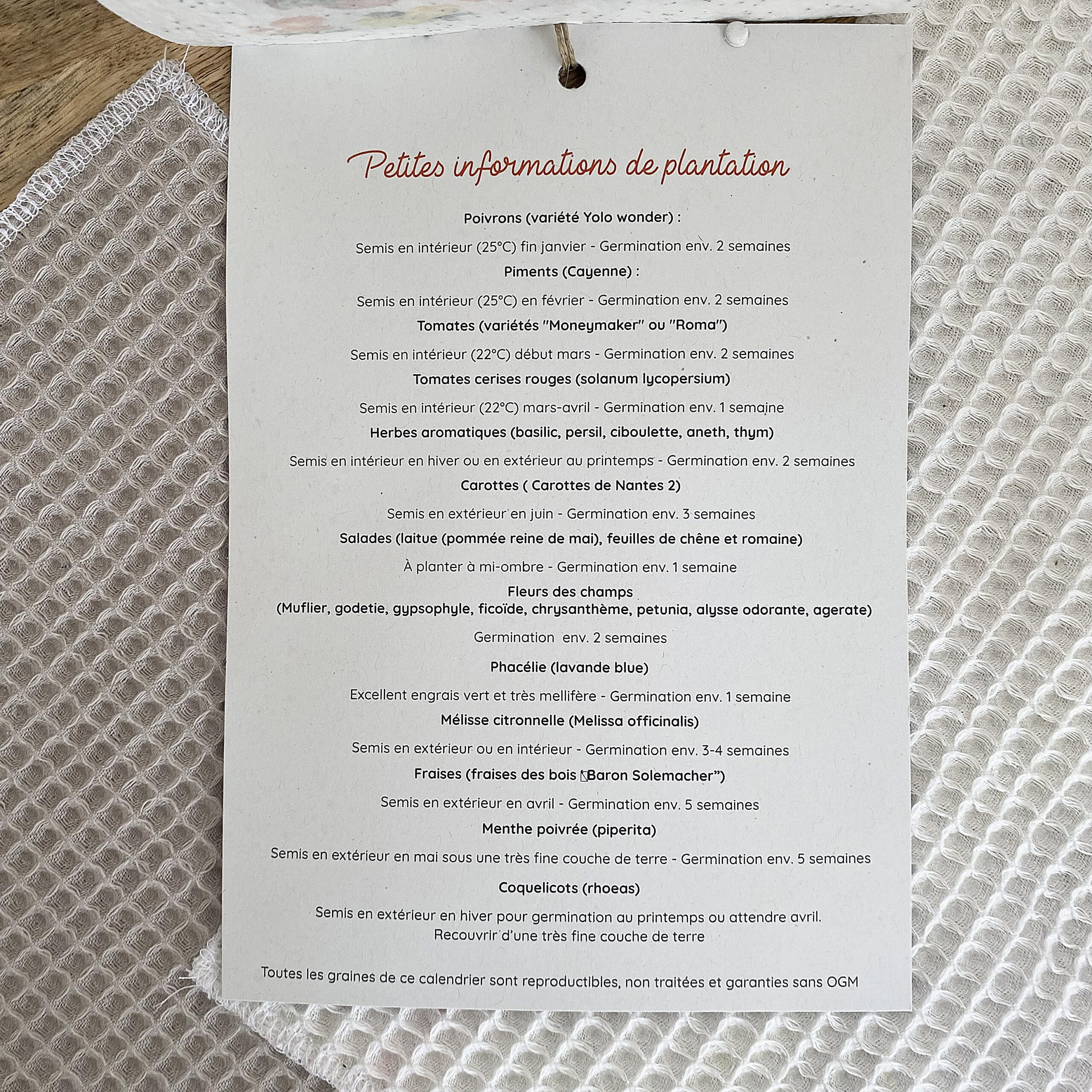 Les graines disponibles dans le calendrier : Poivrons, Piments, Tomates, Tomates cerises, Herbes aromatiques, Carottes, Salades, Fleurs des champs, Phacélie, Mélisse, Fraises, Menthe, Coquelicots