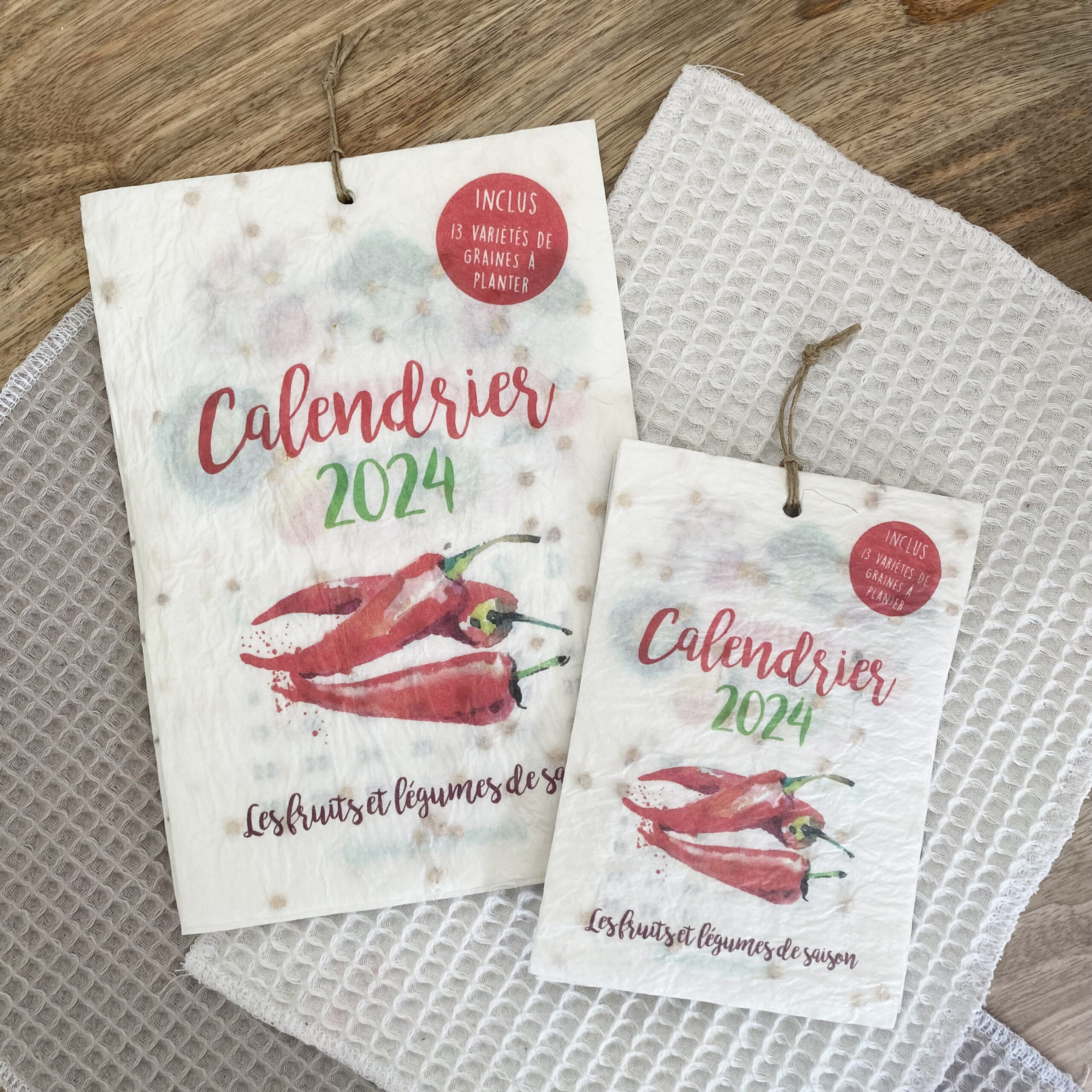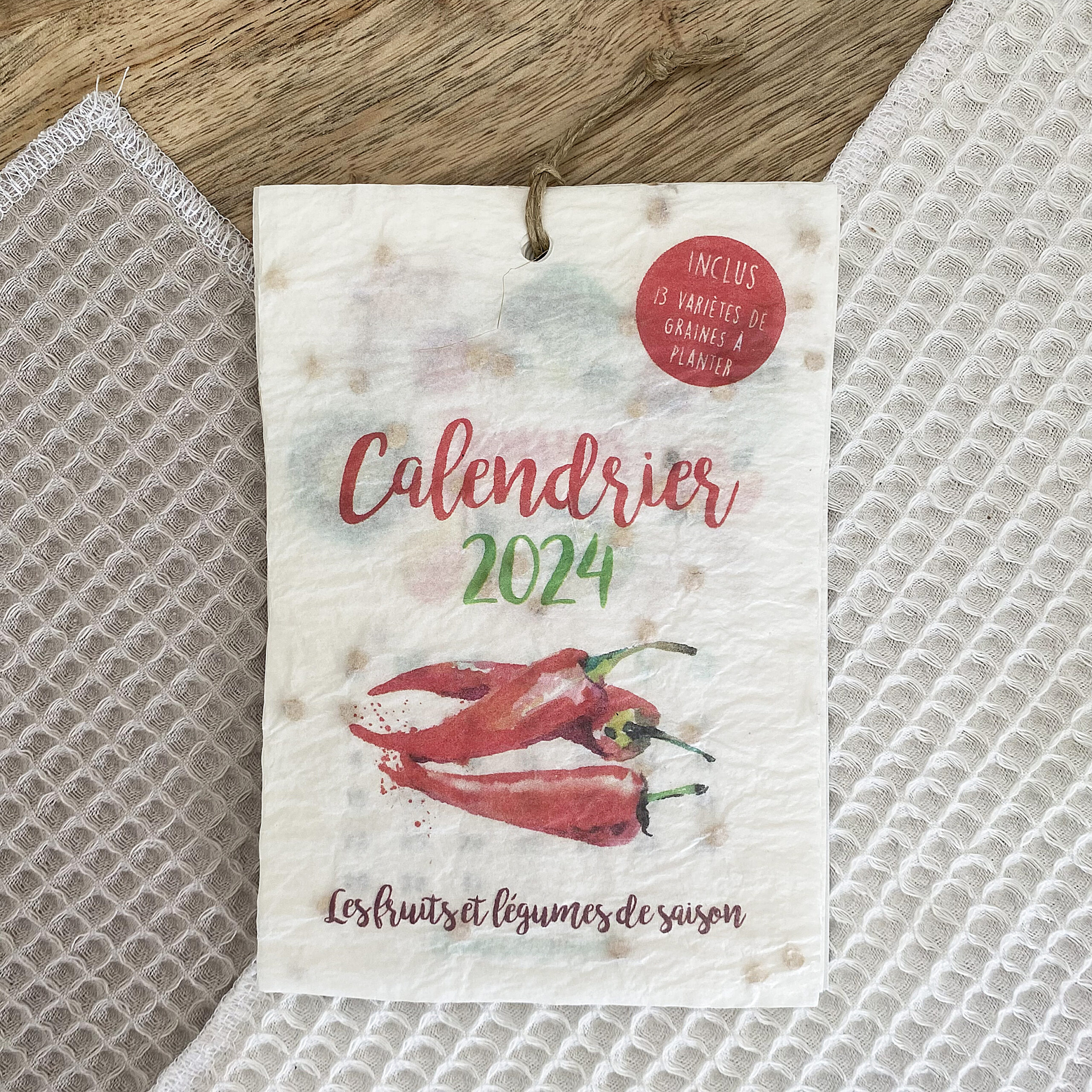 Calendrier à planter en papier naturel avec semences incorporées illustré mois par mois sur le thème des fruits et légumes de saison.