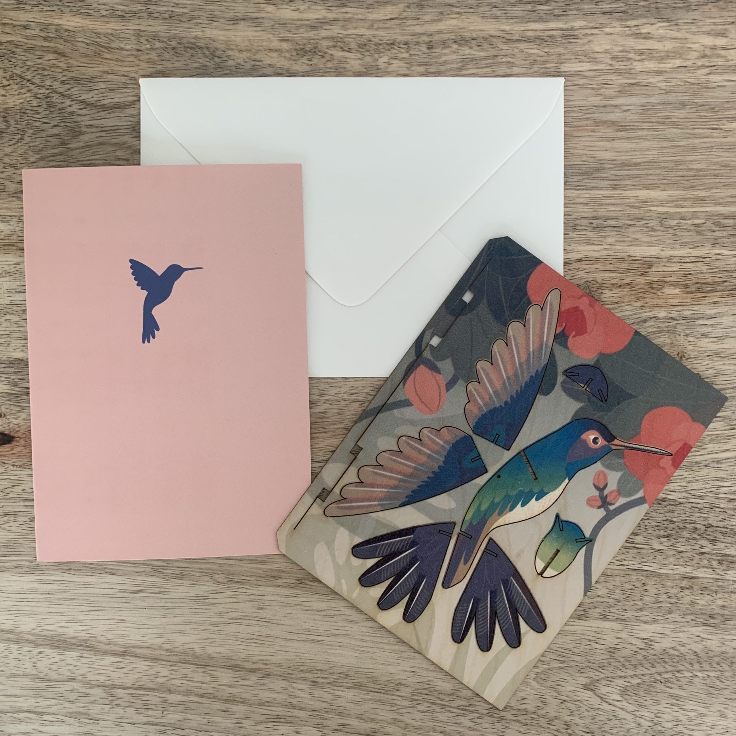 Plutôt que de produire du papier qui finira probablement dans un coin, optez pour la carte en bois sous forme d’une mini maquette qui se construit et se transforme en un joli colibri en 3D.