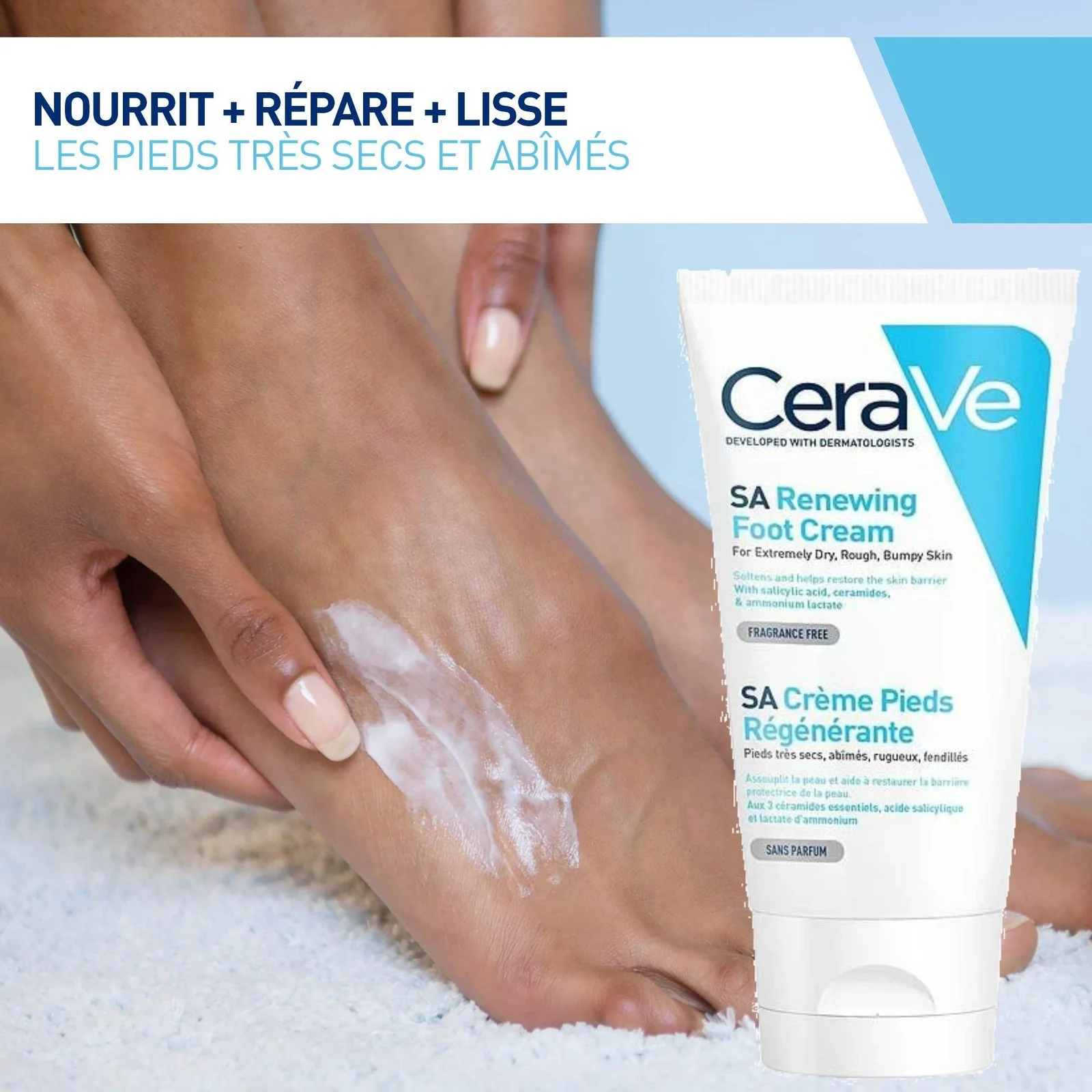- Appliquez une petite quantité de crème pieds régénérante Cerave SA sur vos pieds, en insistant sur les zones sèches et rugueuses.