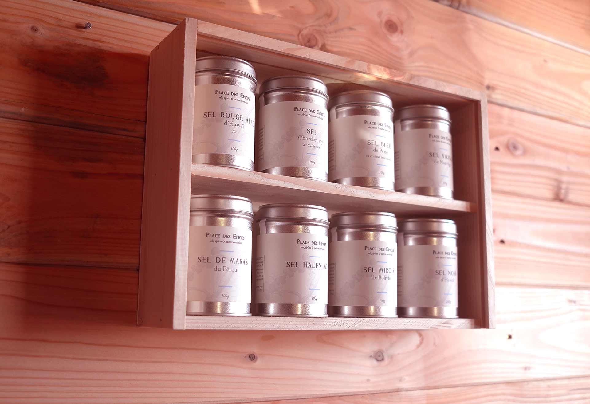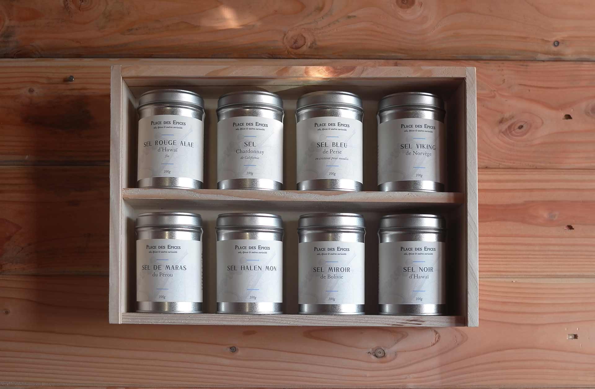 Coffret de 8 sels du monde se transformant en étagère grâce à son couvercle escamotable et ses attaches en laiton. Un voyage salé autour du monde composé de 8 boites de 100g de :