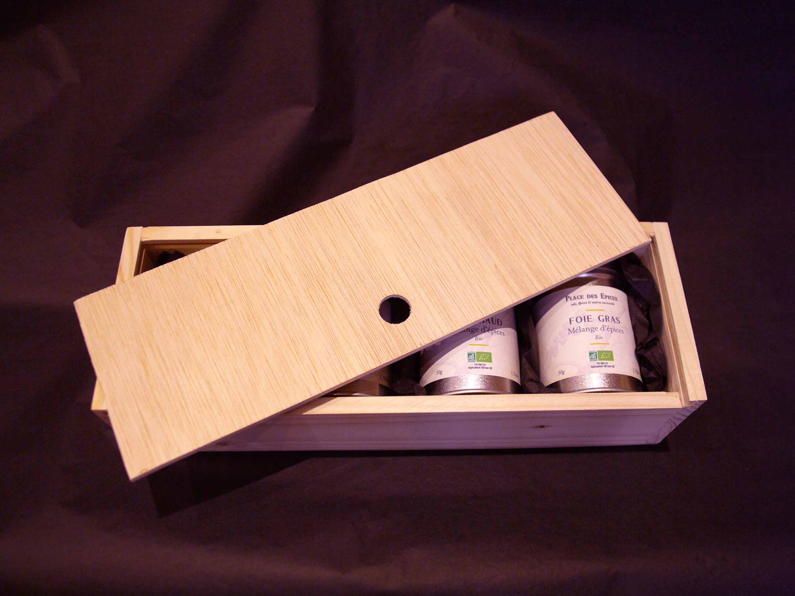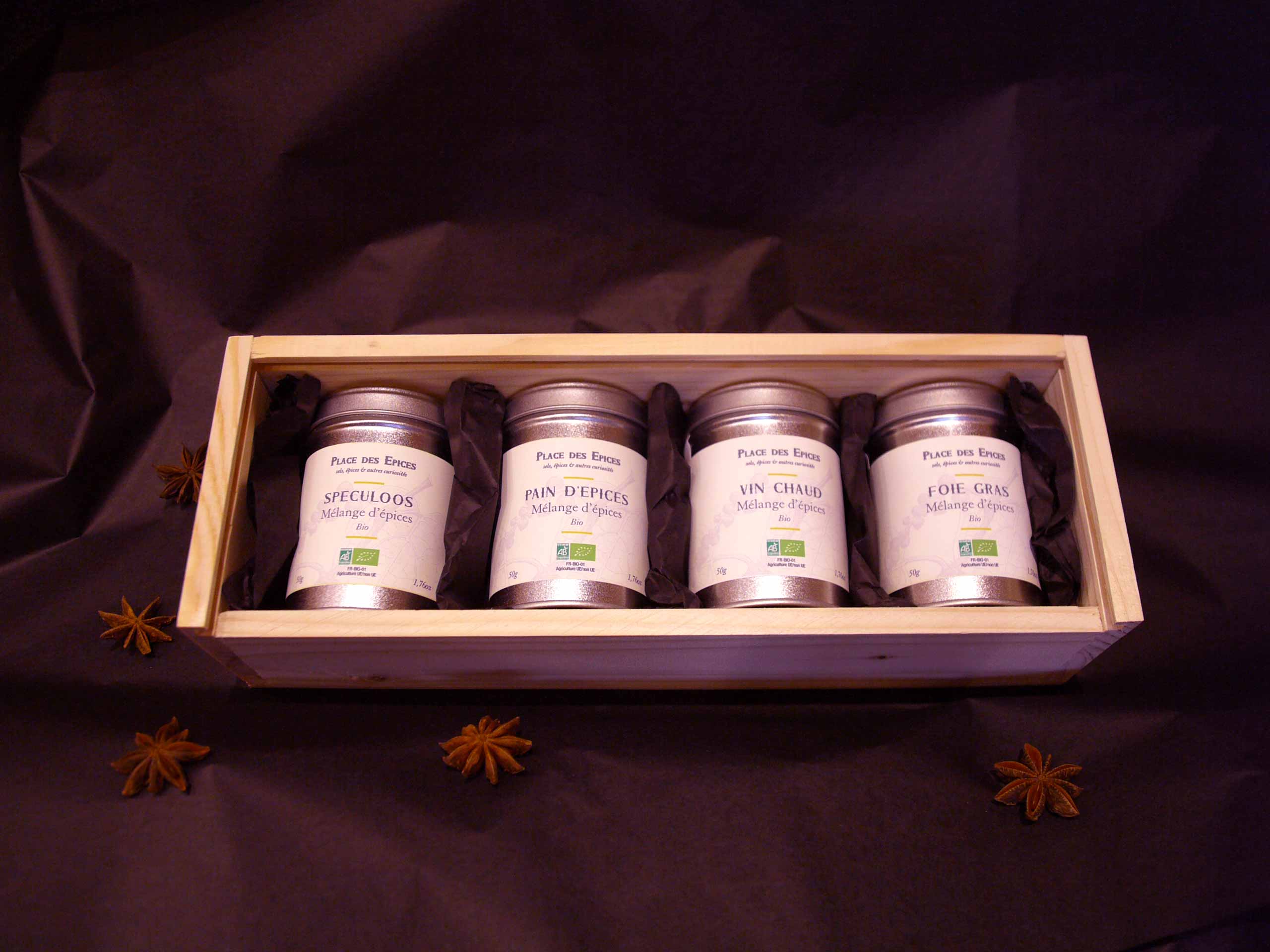 Coffret de 4 mélanges d’épices Bio spécial fêtes de fin d’année. Composé de 4 boites à doubles opercules contenant un mélange Speculoos, un mélange pour pain d’épices, un pour l’assaisonnement du foie gras et un autre pour la réalisation d’un délicieux vin chaud (A consommer bien évidemment avec modération).