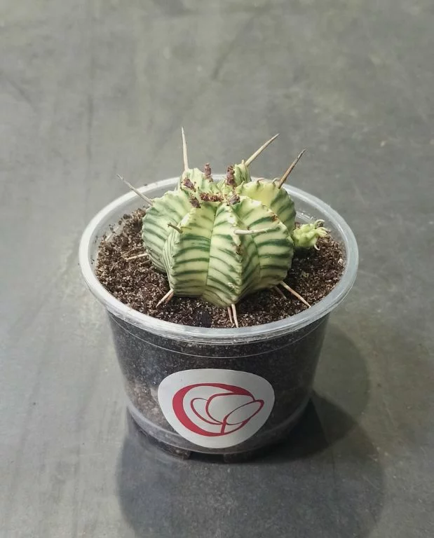 L’Euphorbia Meloformis Variegata se distingue par ses tiges globuleuses et côtelées, qui peuvent atteindre jusqu’à 20 cm de diamètre. Sa coloration variegata, un mélange de vert vif et de stries blanches ou crème, apporte une touche esthétique unique. La plante présente peu ou pas de feuilles, et lorsqu’elles apparaissent, elles sont petites et caduques. En période de floraison, elle produit de petites fleurs jaunes discrètes mais charmantes, qui contrastent joliment avec le feuillage.