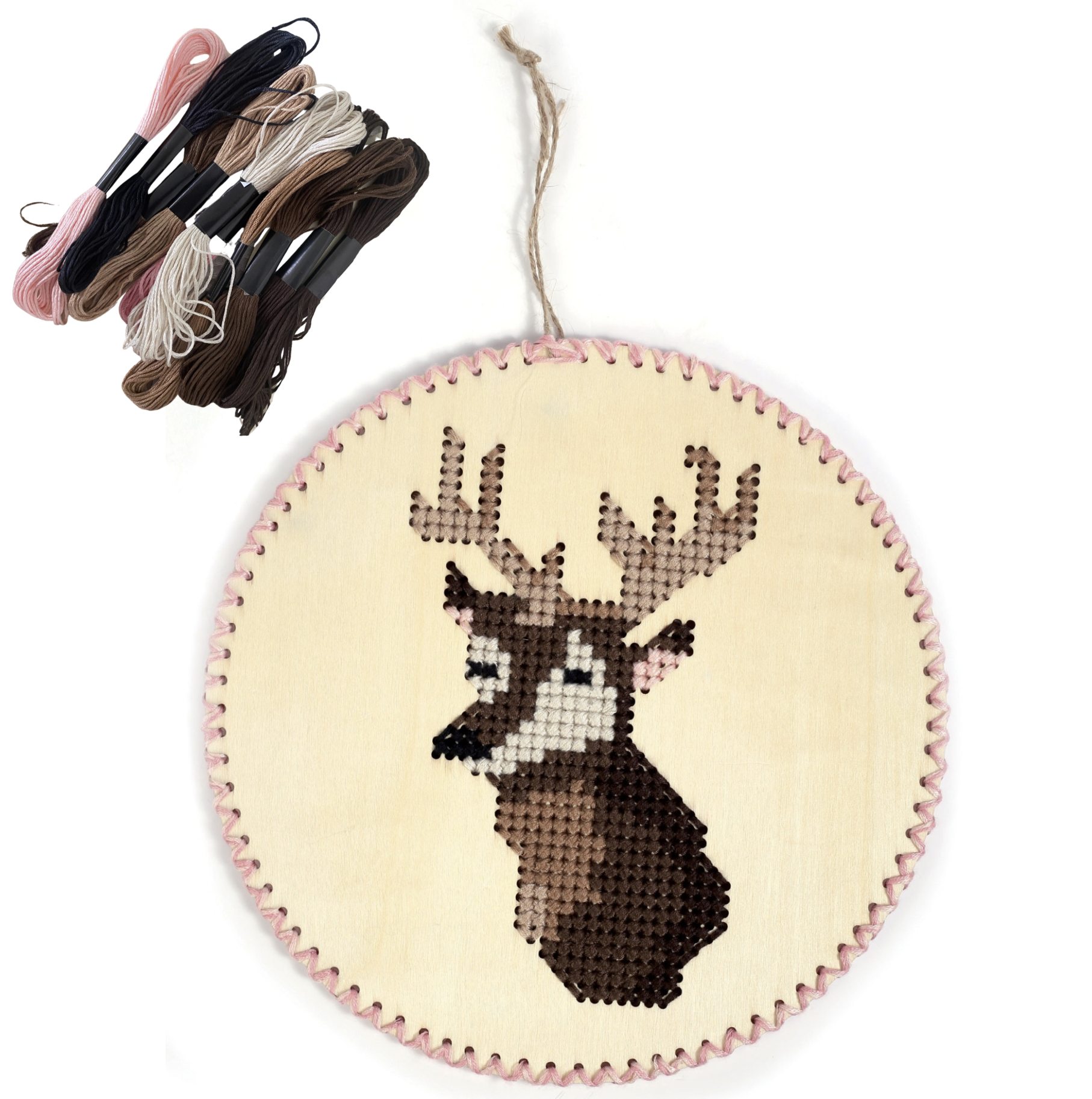 Apprenez à broder en toute facilité avec ce petit kit pour broder un renne sur un panneau de bois.