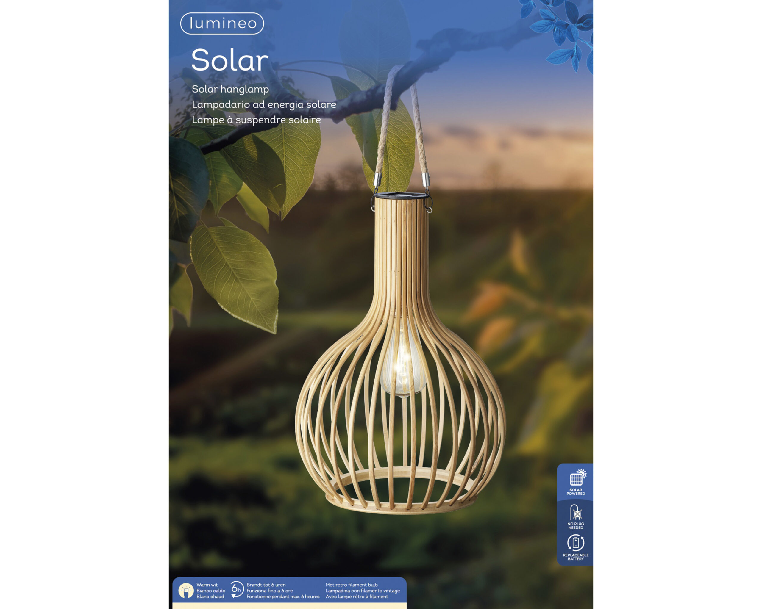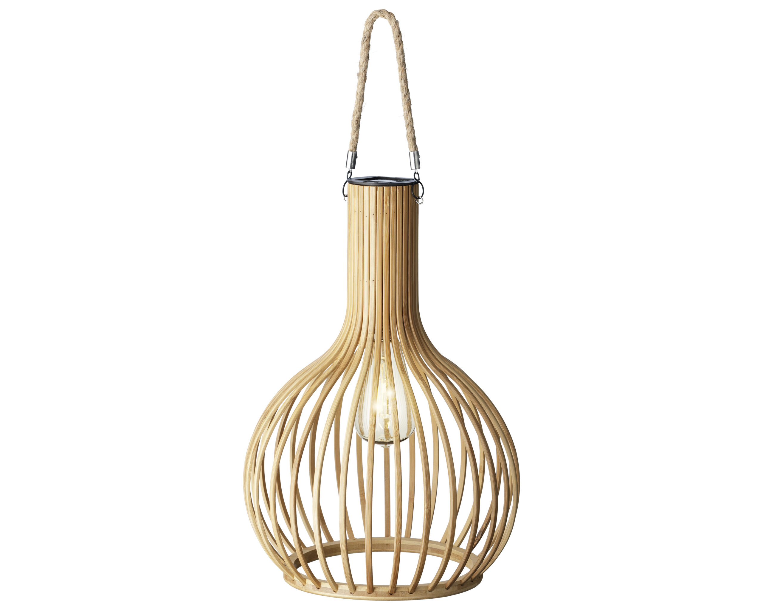 Cette jolie suspension en bambou créera une ambiance apaisante dans votre jardin. Le soir, automatiquement à la nuit tombée, la lampe va s’allumer.