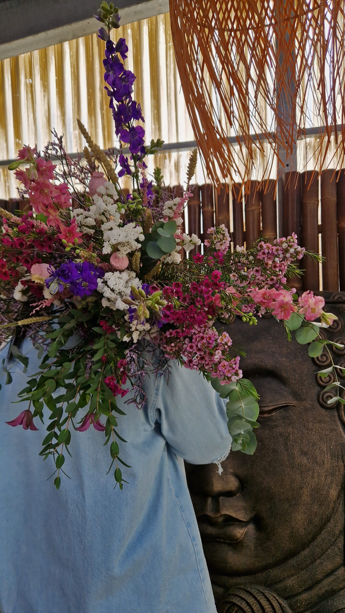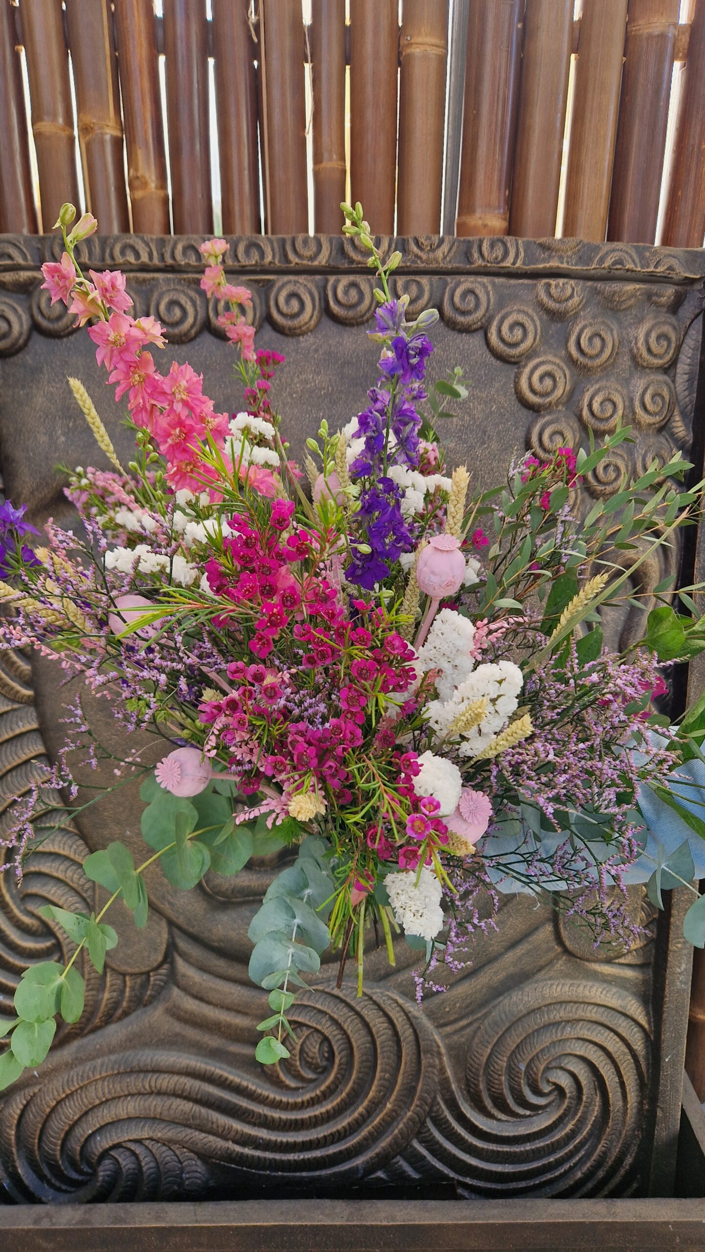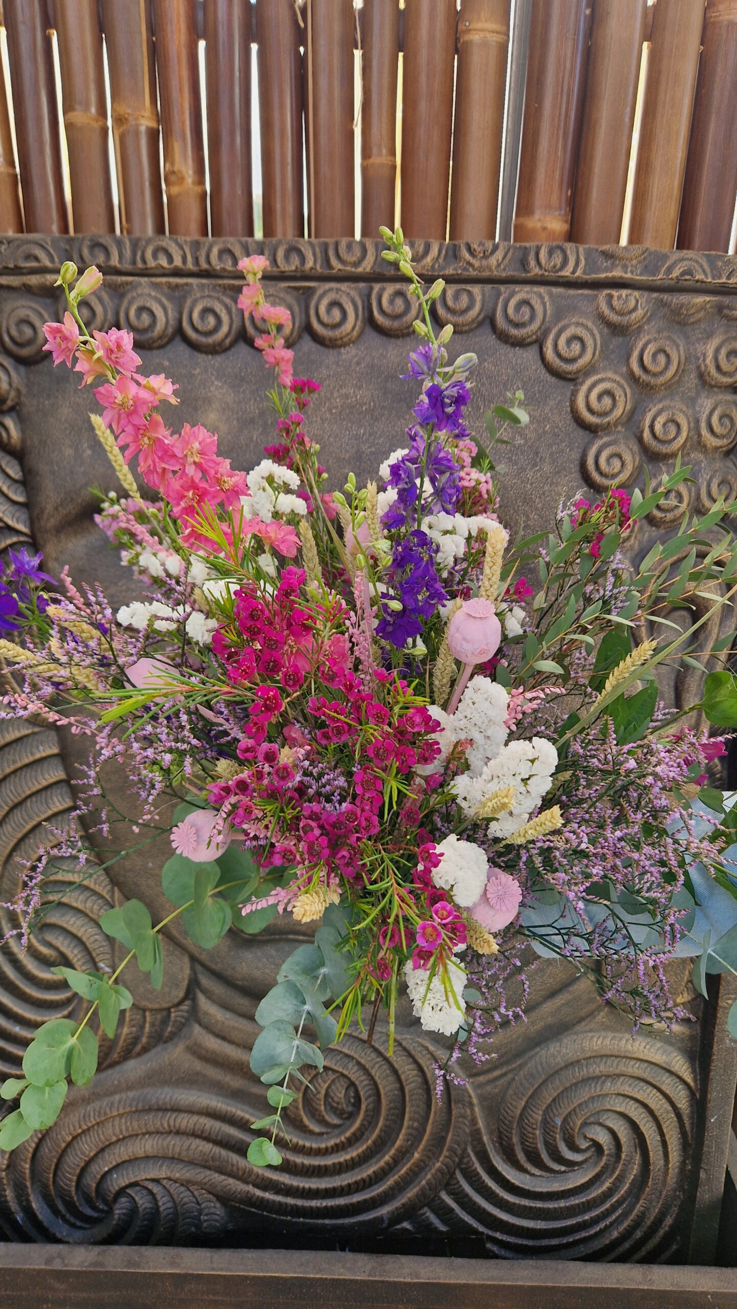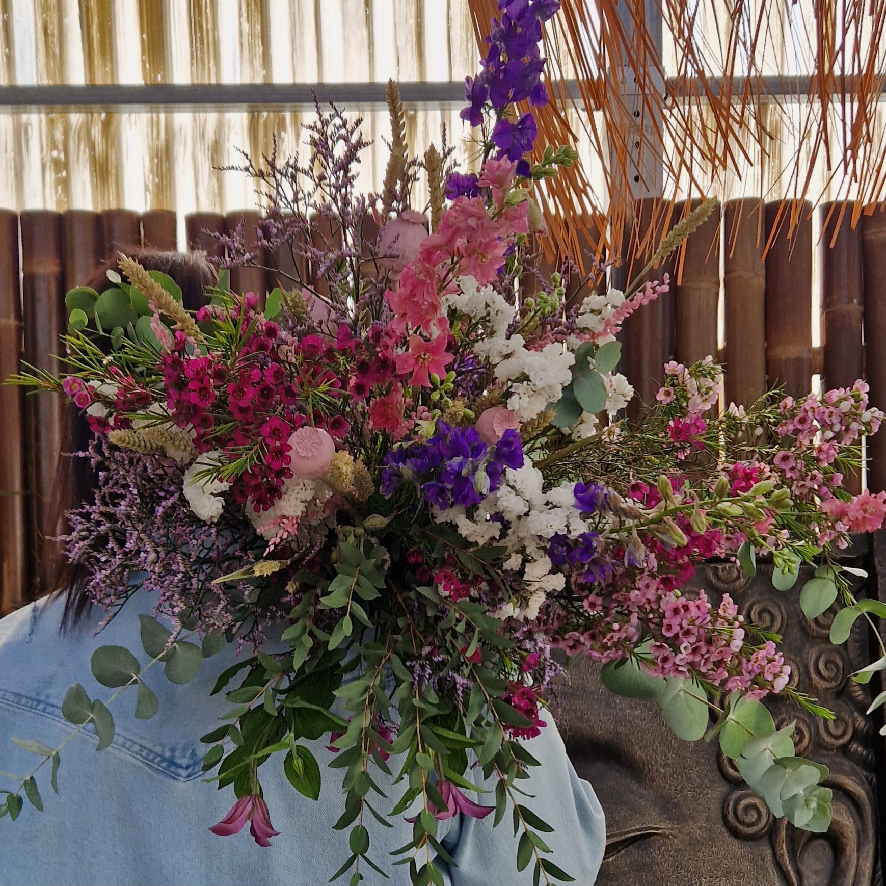 Bouquet de fleurs fraîches composé de plusieurs branches d’Eucalyptus, de wax, d’alouette, de limonium, épis de blé…