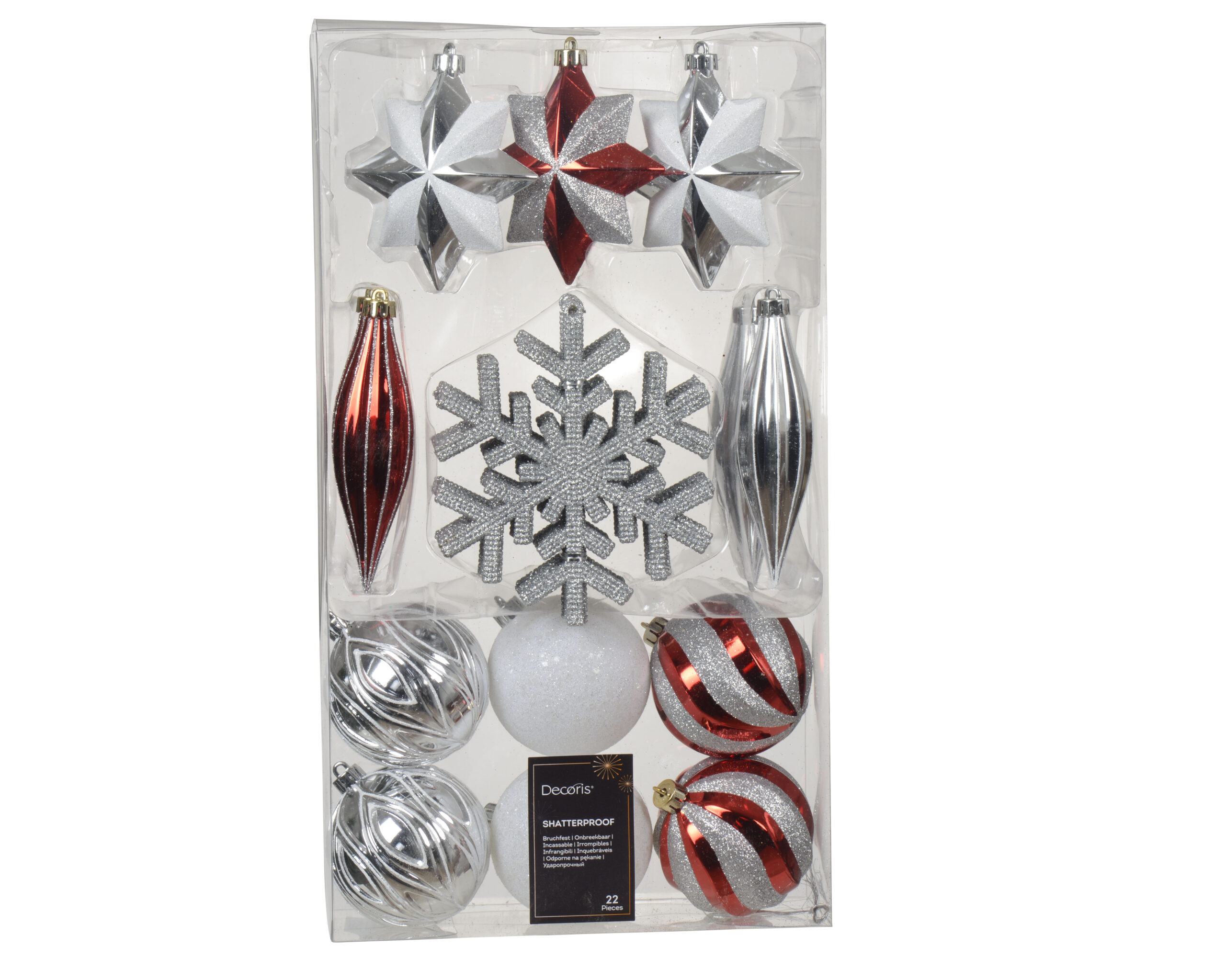 Boite de 22 Boules de Noël déclinées dans les tons de blanc, rouge, argent. Idéales pour décorer le sapin naturel ou artificiel.