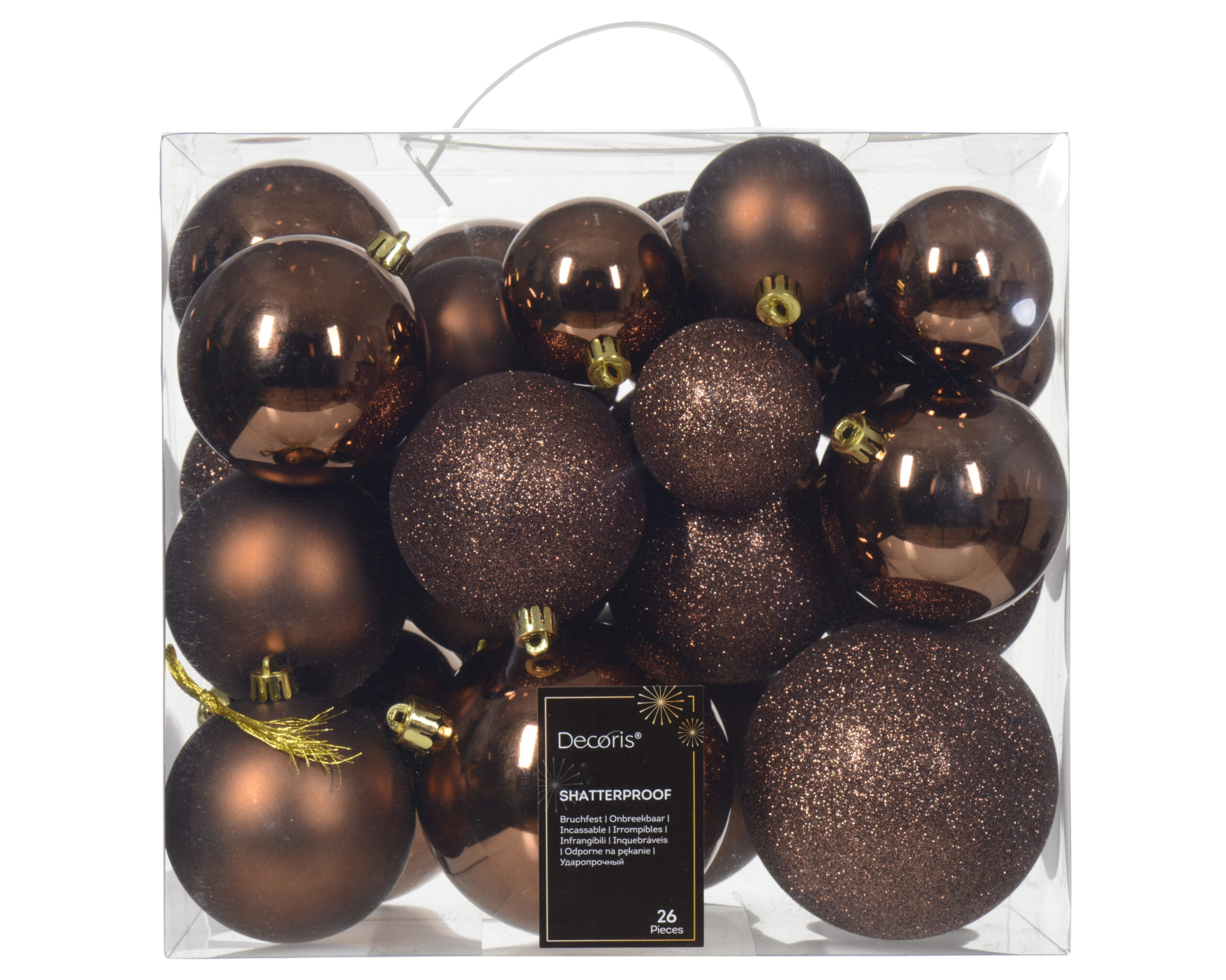 Lot de 26 boules incassables, brillantes, mats et pailletées.