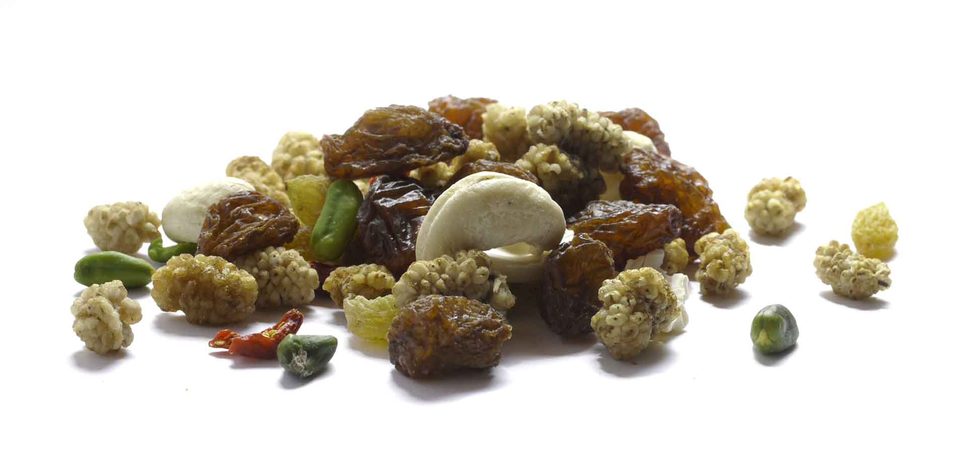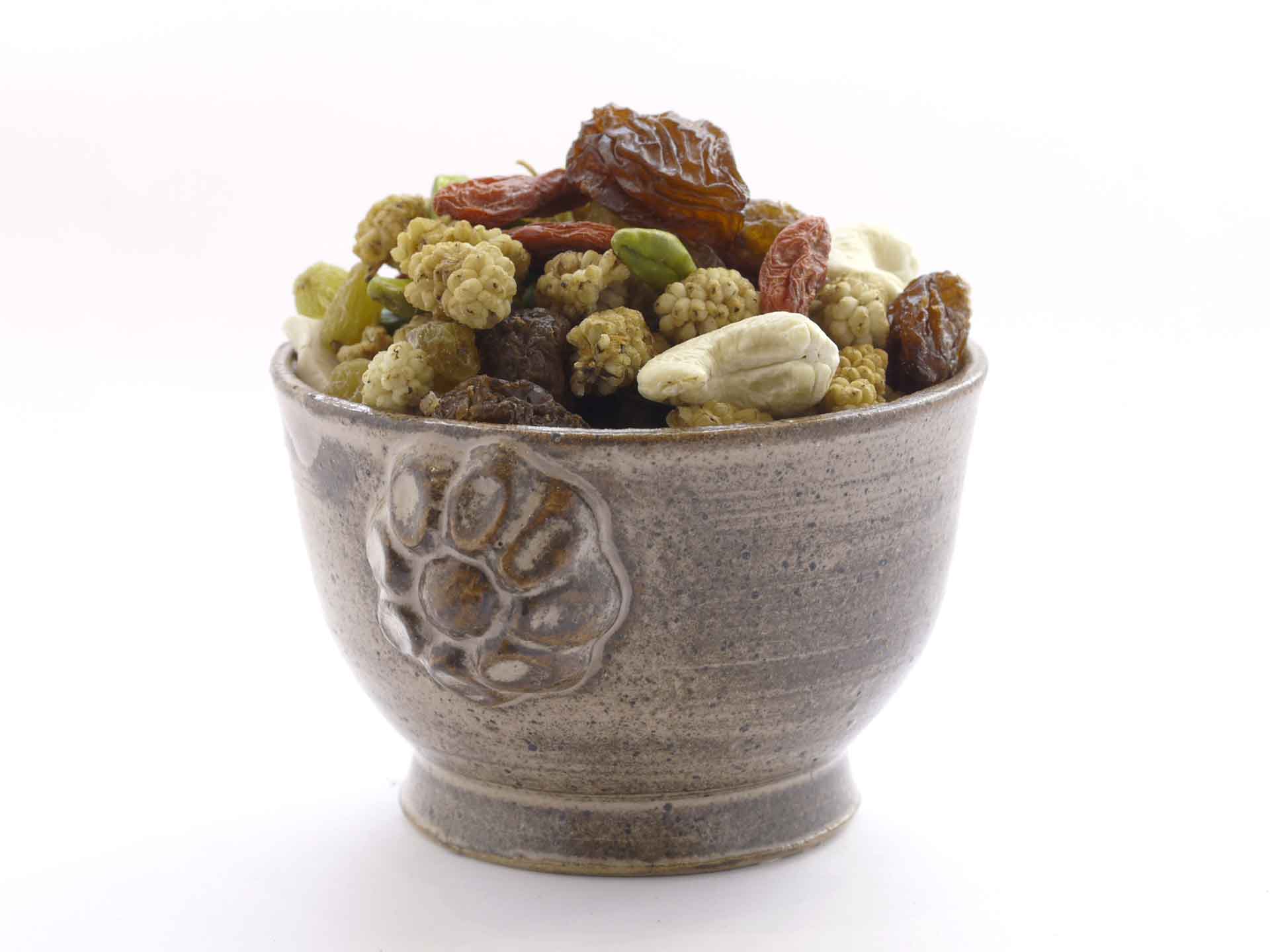 Ingrédients : Raisins de Korogh, noix de cajou, mûres blanches, baies de goji, pistaches émondées et raisin brun Manuka tous issus de l’agriculture biologique FR-BIO-01