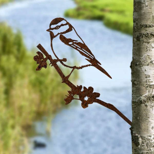 Cette belle mésange bleue a été dessinée à la main par l’artiste Phil Waters, puis découpée au laser dans de l’acier corten résistant aux intempéries.