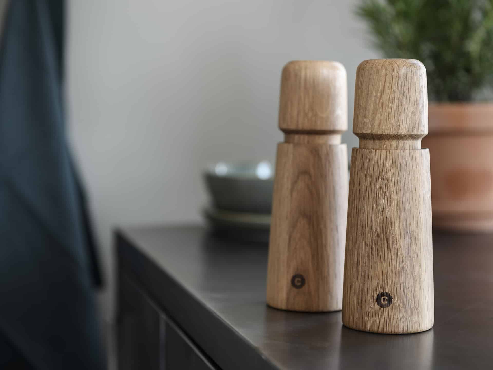 Coffret de deux Moulin à poivre ou à sel/épices en chêne massif, le moulin Stockholm existe en plusieurs versions dont la magnifique version en bois et porcelaine.
