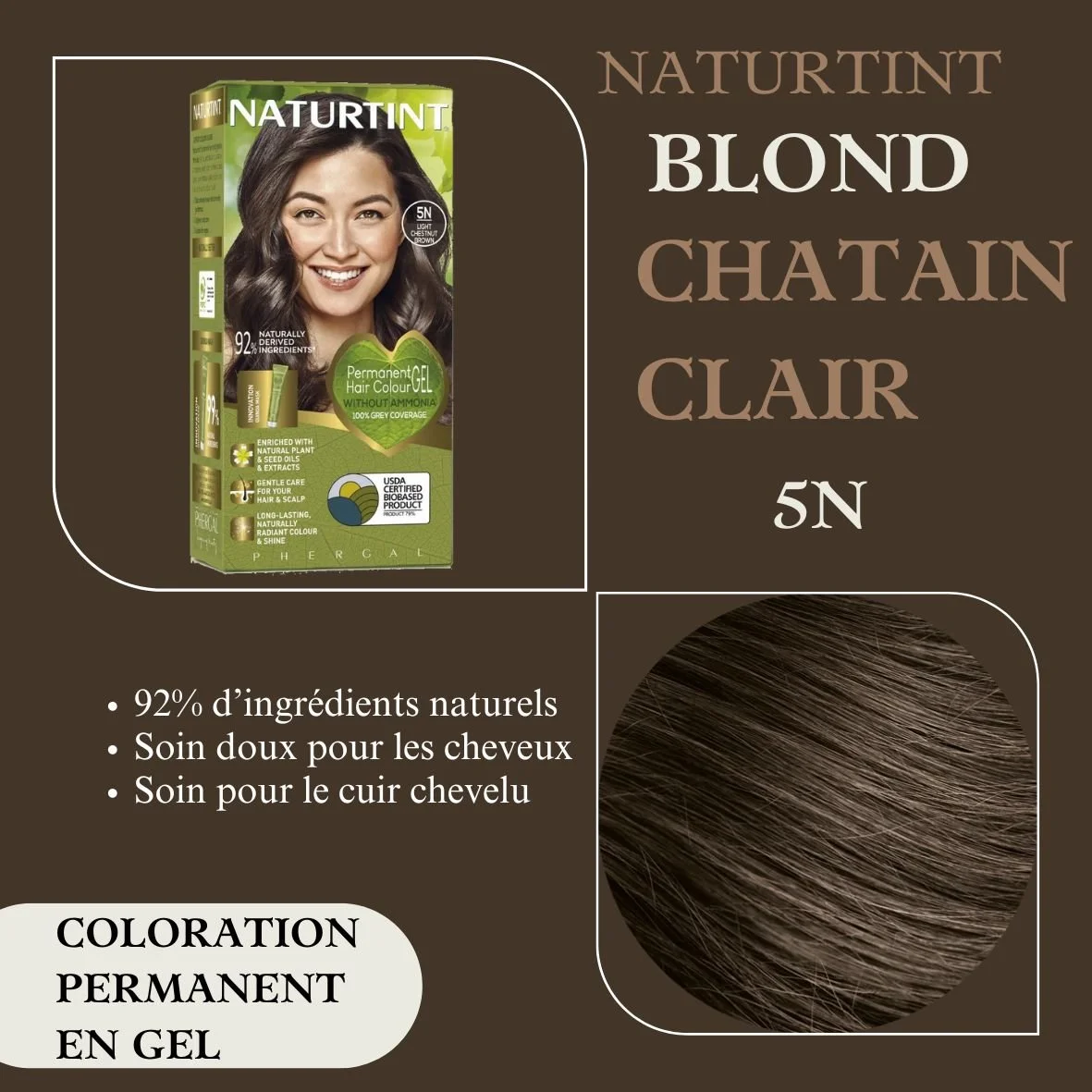 La coloration NATURTINT coloration 5N châtain clair est une teinture permanente sans ammoniaque, offre une couverture optimale des cheveux gris tout en respectant la santé du cuir chevelu et des cheveux.