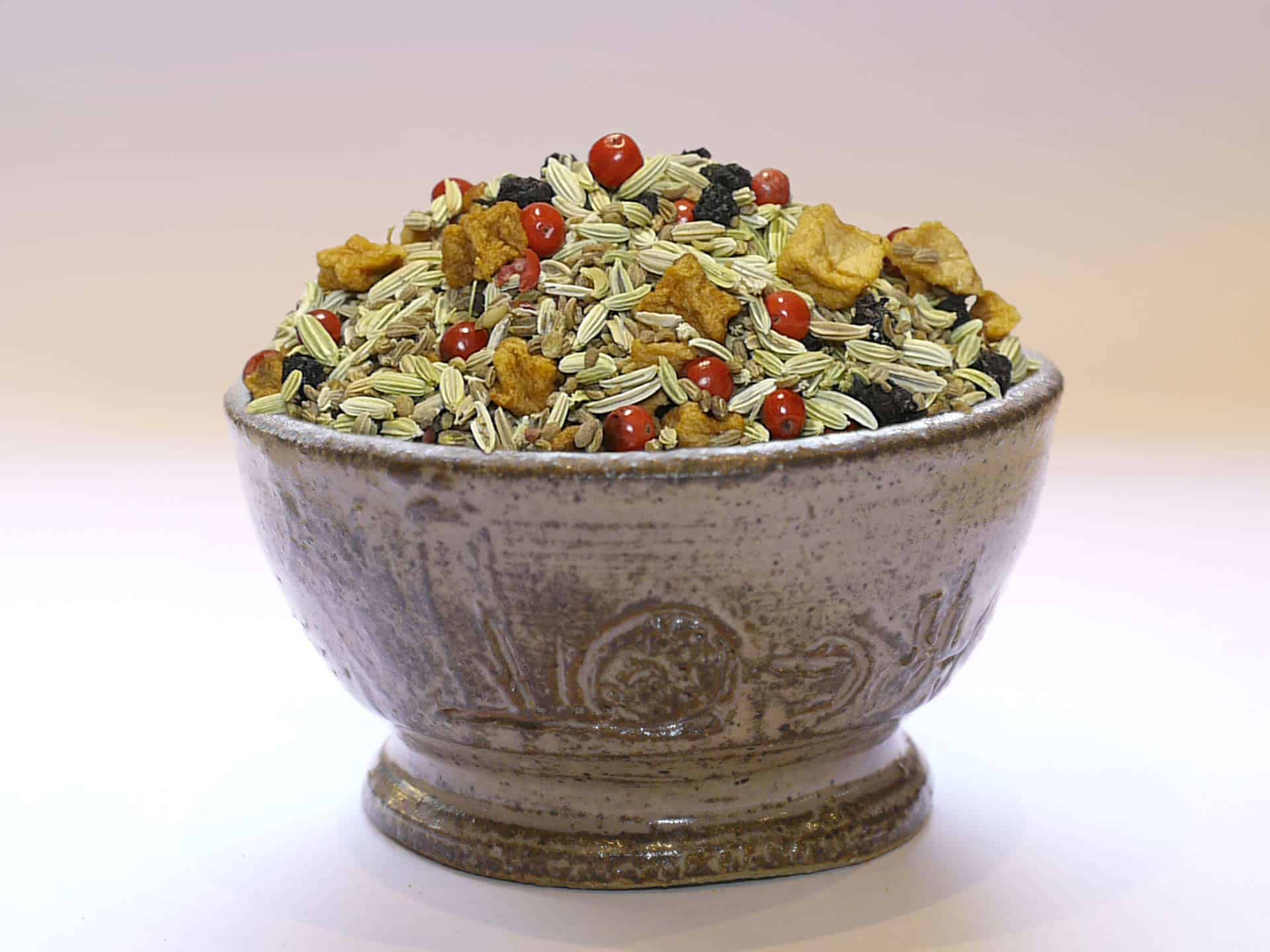 Pan Masala revisité 100% naturel, composé de Baies roses de poivre de Bahia, de fenouil, anis vert, fruit du sureau et morceaux de pommes. Ne contient aucun sucre ajouté, aucun colorant comme malheureusement la majeure partie des pan masala indiens.
