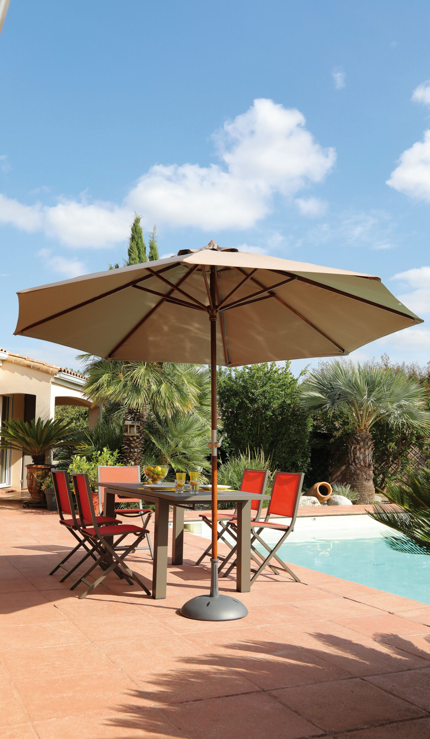 Cette toile est facilement remplaçable, ce qui fait du parasol Ø 300 un point d’ombre nomade et durable que vous aurez plaisir à utiliser année après année.