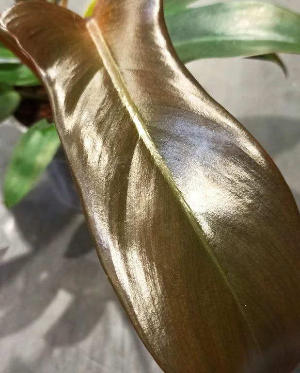 Le feuillage du Philodendron Florida Bronze est son atout majeur. Ses feuilles lobées, souvent comparées à des étoiles ou à des mains ouvertes, présentent une texture légèrement brillante et une coloration unique. Lorsqu’elles émergent, elles arborent un ton bronze cuivré, qui évolue progressivement vers un vert profond avec des reflets satinés.