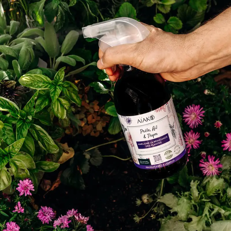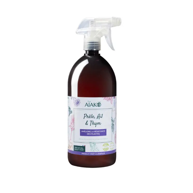 Préparation naturelle à usage bio-stimulant à base de prêle, ail et thym bio, autorisée selon le Décret 2019-329 du 16 avril 2019 relatif aux substances naturelles à usage bio-stimulant et aux préparations naturelles peu préoccupantes en contenant.