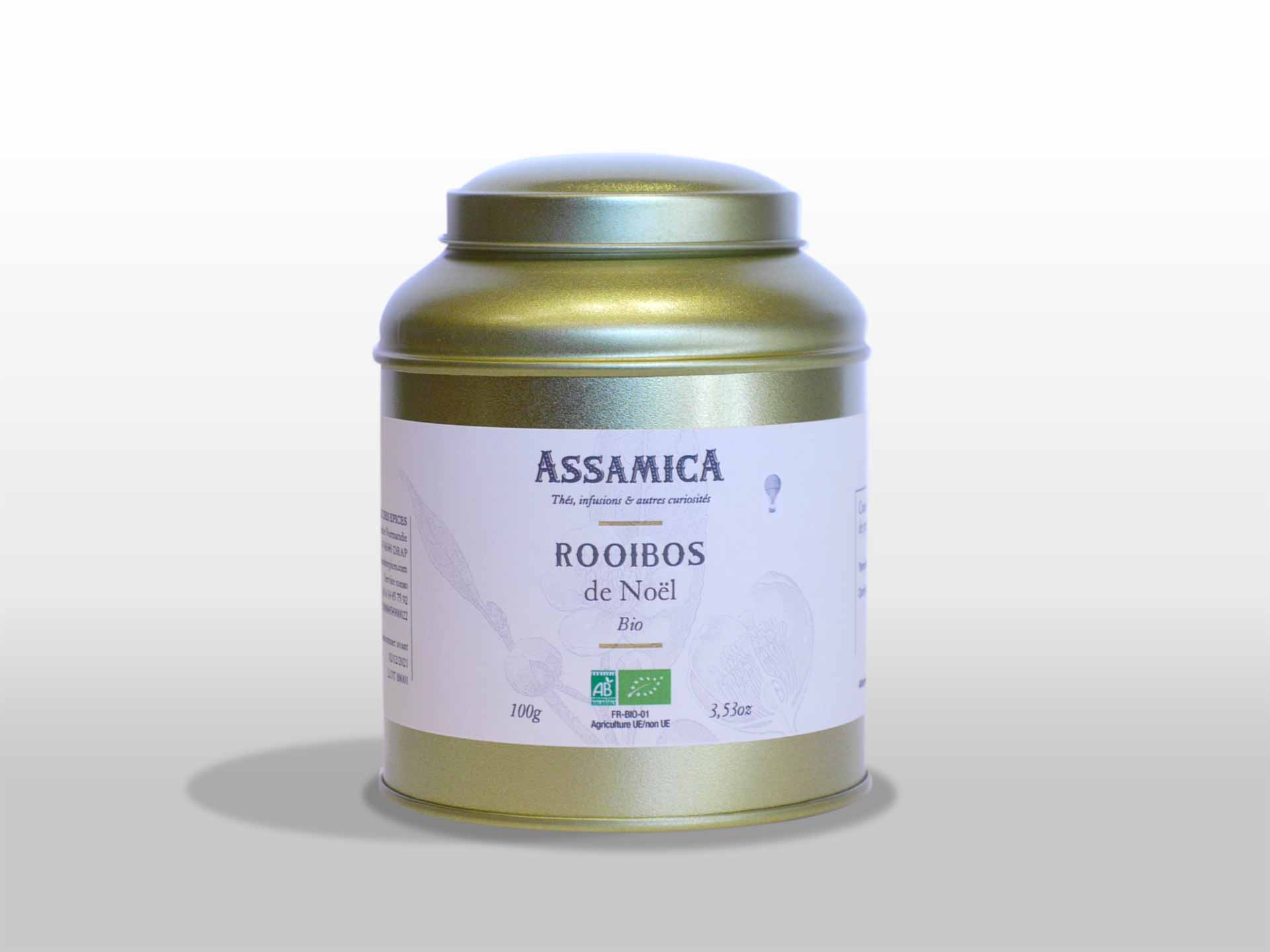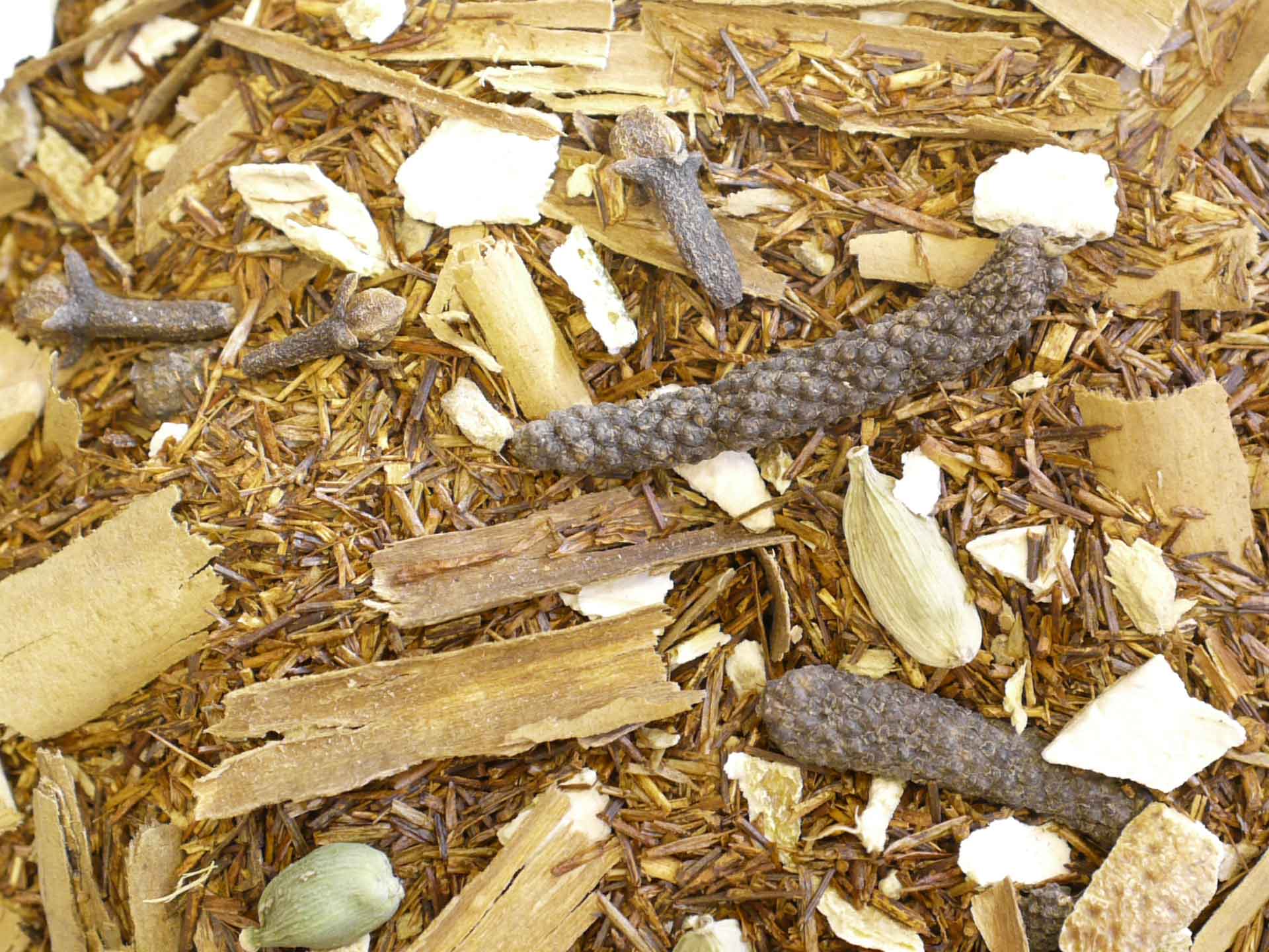Ingédients : rooibos bio (Aspalathus linearis), cannelle tuyau du sri lanka bio (Cinnamomum verum J. Presl), cardamome verte bio (Elettaria cardamomum (L.) Mato), gingembre rhizome bio (Zingiber officinale Roscoe), poivre long bio (Piper longum L.) clou de girofle bio (Syzygium aromaticum (L.) Merr.) et zestes d’orange douce bio (Citrus sinensis (L.) Osbeck)