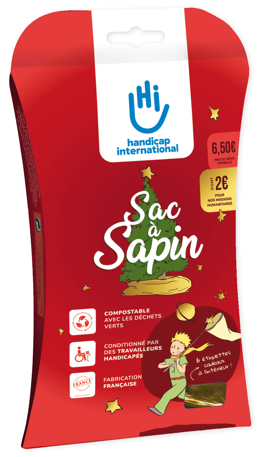 Depuis plus de 25 ans, le Sac à Sapin de Handicap International est l’accessoire pratique et généreux des fêtes de fin d’année. Il est 100 % fabriqué en France et conditionné par des personnes handicapées en ESAT (Etablissement et Service d’Aide par le Travail). Il est aussi biodégradable et compostable avec les déchets verts. Sur chaque vente, 2€ permet de financer les actions terrain de l’association dans 60 pays, notamment l’association œuvre pour l’accès des enfants à l’éducation dans le monde.