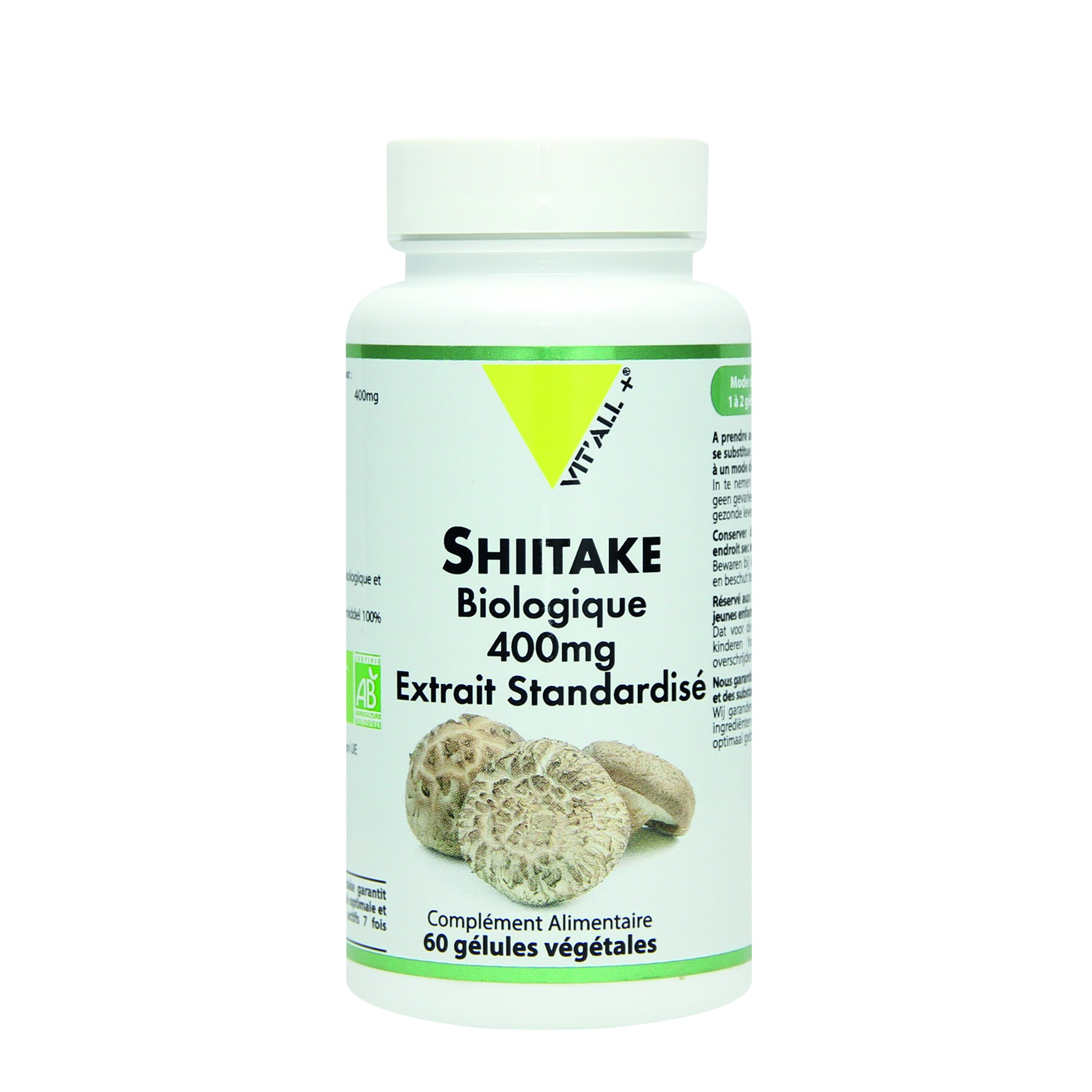 Ingrédient Par gélule Shiitake (Lentinus edodes) – champignon • extrait standardisé à 30% polysaccharides et à 15% Beta-glucanes soit une concentration 7 fois supérieure à la poudre classique