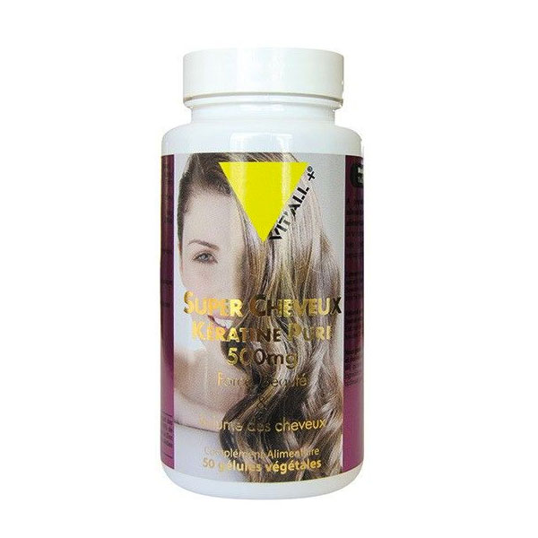 Description Super cheveux est un complément alimentaire particulièrement riche en kératine qui aide à fortifier la fibre capillaire et à encourager la repousse des cheveux. Protéine fibreuse renfermant 18 acides aminés, la kératine est la composante essentielle du cheveu. Responsable de la résistance et de la souplesse des cheveux, elle protège également les fibres capillaires des ultraviolets. Son rôle structurant et protecteur en fait un actif de choix pour maximiser la beauté de la chevelure. Pure et hautement biodisponible, elle offre un apport conséquent de 500 mg par gélule.