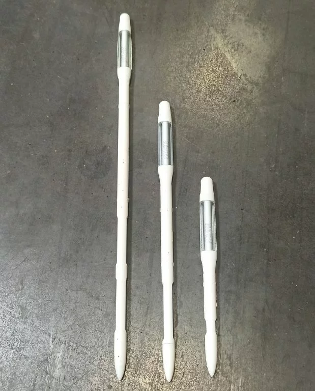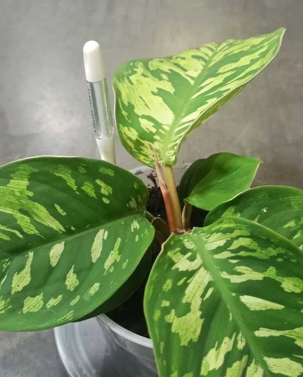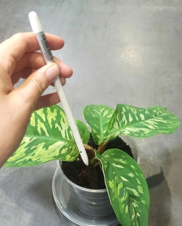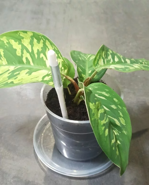 Enfoncez le SUStee dans le sol à la base de la plante en pot à une profondeur comprise entre les repères “►” and “◀︎” de la flèche. Il changera de couleur du blanc au bleu dans les 20 à 30 minutes après l’arrosage. Bleu ⇒ suffisamment d’eau dans le sol. Blanc ⇒ en besoin d’arrosage