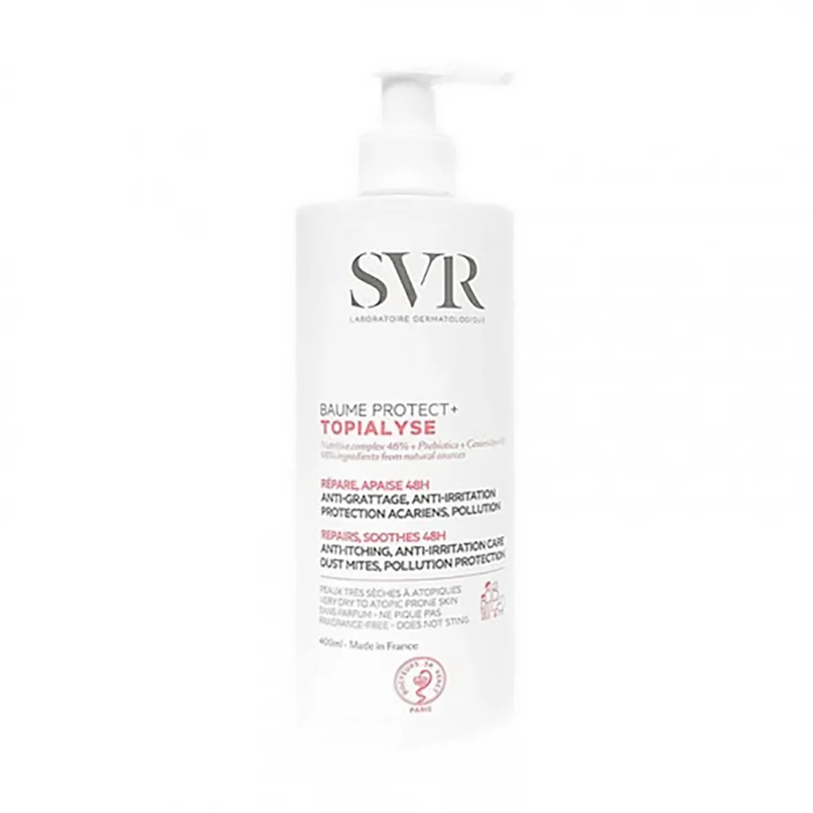 SVR Topialyse Baume Protect+ 400ML pour les peaux sèches, très sèches et à tendance atopique, sujettes aux irritations, aux démangeaisons et à l’eczéma. Il peut être utilisé sur le visage et le corps, dès la naissance.