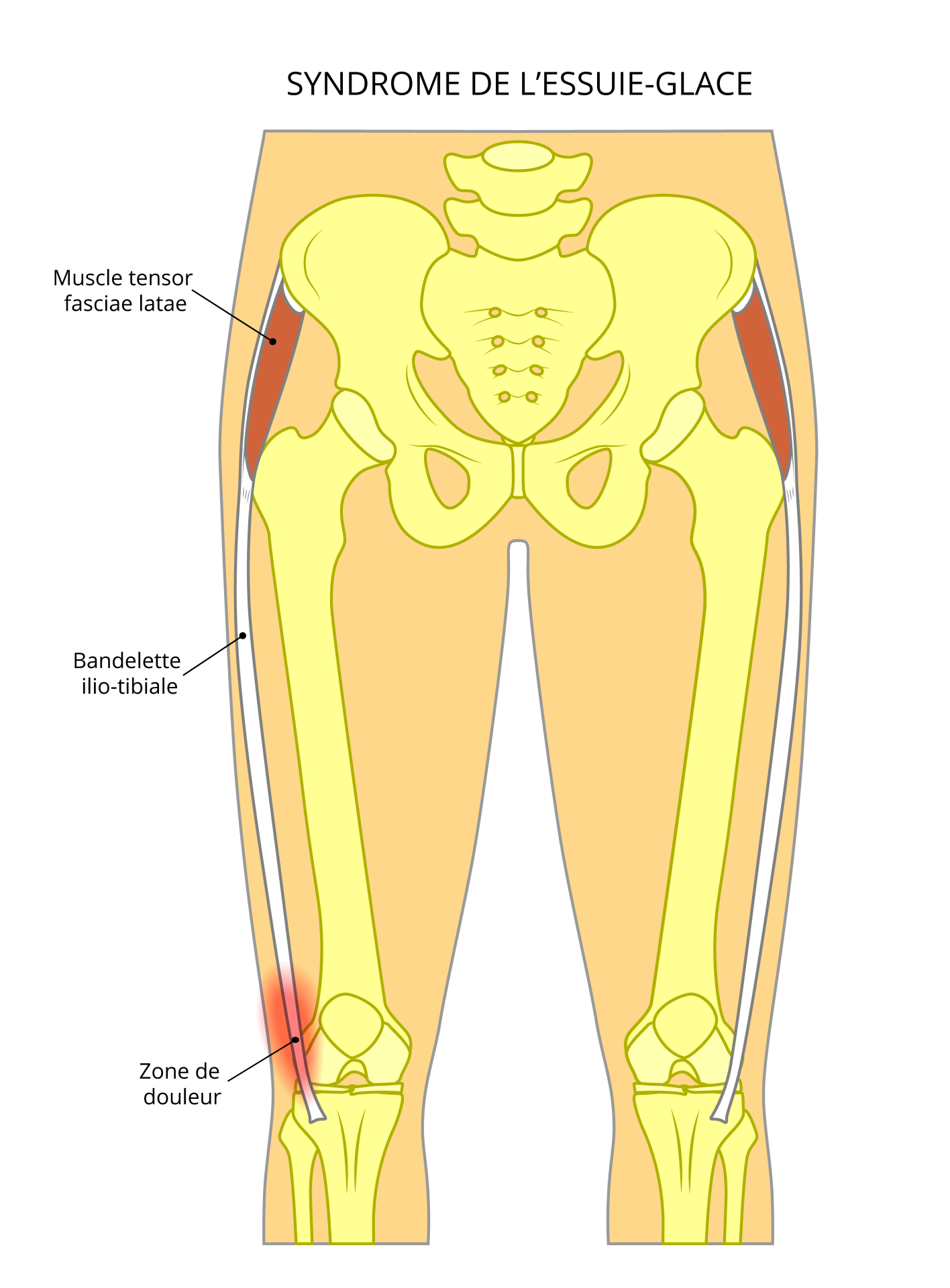 A chaque foulée, la partie basse du tendeur fascia lata (ou TFL, muscle plat de la face externe de la cuisse) se déplace d’avant en arrière à la manière d’un essuie-glace, et vient dans certains cas accrocher au passage la tête du fémur, sur le côté extérieur du genou.