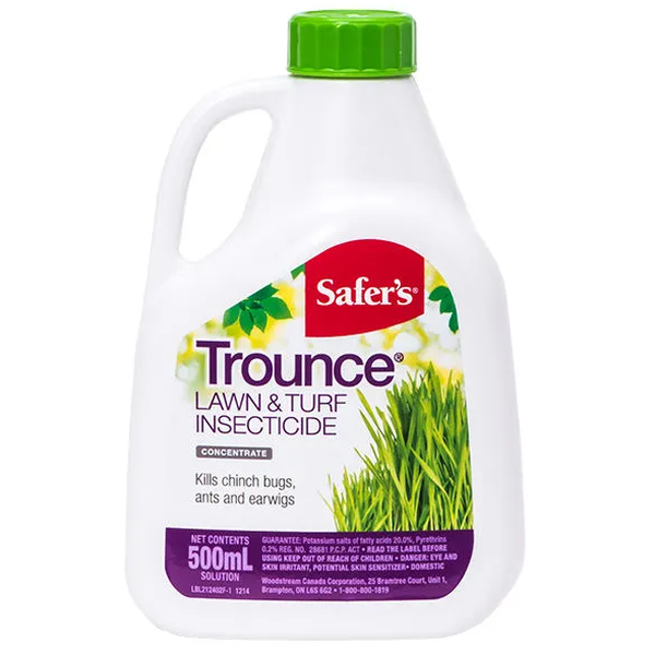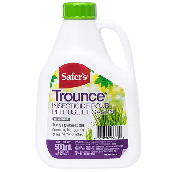 L’insecticide pour pelouse et gazon Safer’s Trounce tue les punaises des céréales, les fourmis et les perce-oreilles dans les pelouses et le gazon. Les pyréthrines attaquent le système nerveux de l’insecte et les sels de potassium affaiblissent la coque extérieure protectrice de l’insecte. Cette bouteille de 500 ml fournira environ 7 à 21 mètres carrés de couverture en fonction de la gravité du problème de ravageurs. Renouveler l’application 10 à 14 jours plus tard si nécessaire.